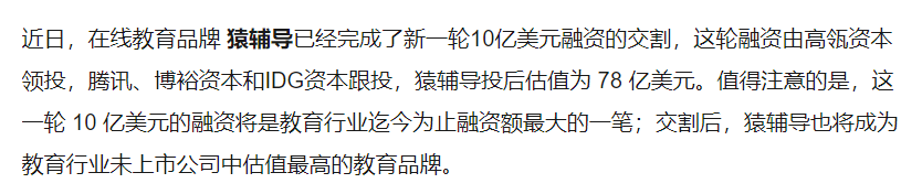 猿輔導(dǎo)在線(xiàn)教育,國(guó)內(nèi)K-12在線(xiàn)教育領(lǐng)域首個(gè)獨(dú)角獸公司,目前估值達(dá)到155億美元。