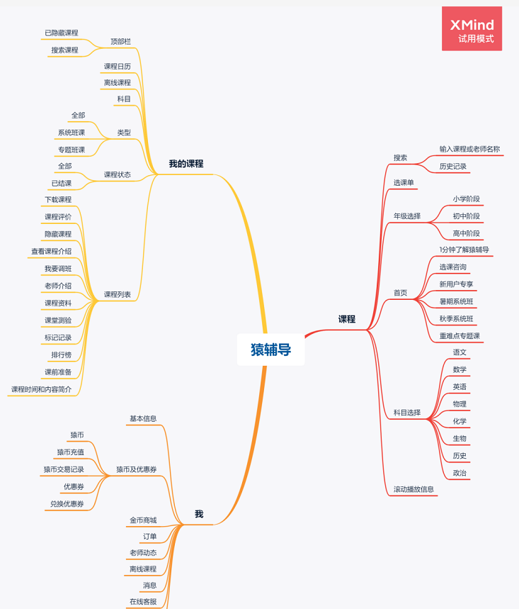 通過(guò)對(duì)app目前功能的腦圖拆解(見(jiàn)下圖)猿輔導(dǎo)在整體功能上邏輯清晰,簡(jiǎn)單高效。產(chǎn)品設(shè)計(jì)上對(duì)細(xì)節(jié)把控很好,功能布局合理,能給用戶(hù)比較好的體驗(yàn)感,很好的滿(mǎn)足了用戶(hù)在買(mǎi)課前和買(mǎi)課后的需求。
