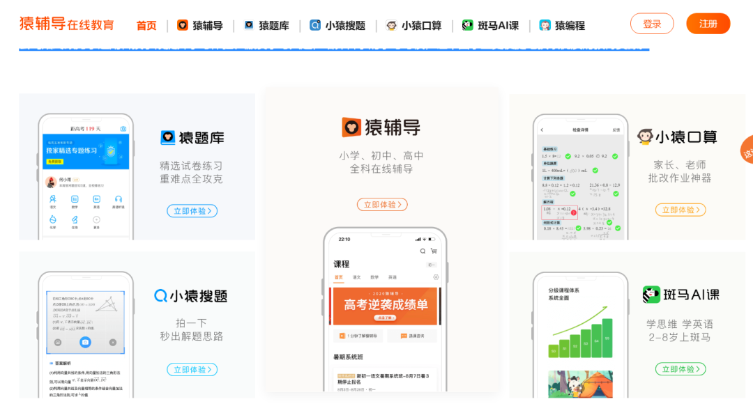 猿輔導(dǎo)、猿題庫(kù)、小猿搜題、小猿口算、斑馬AI課。