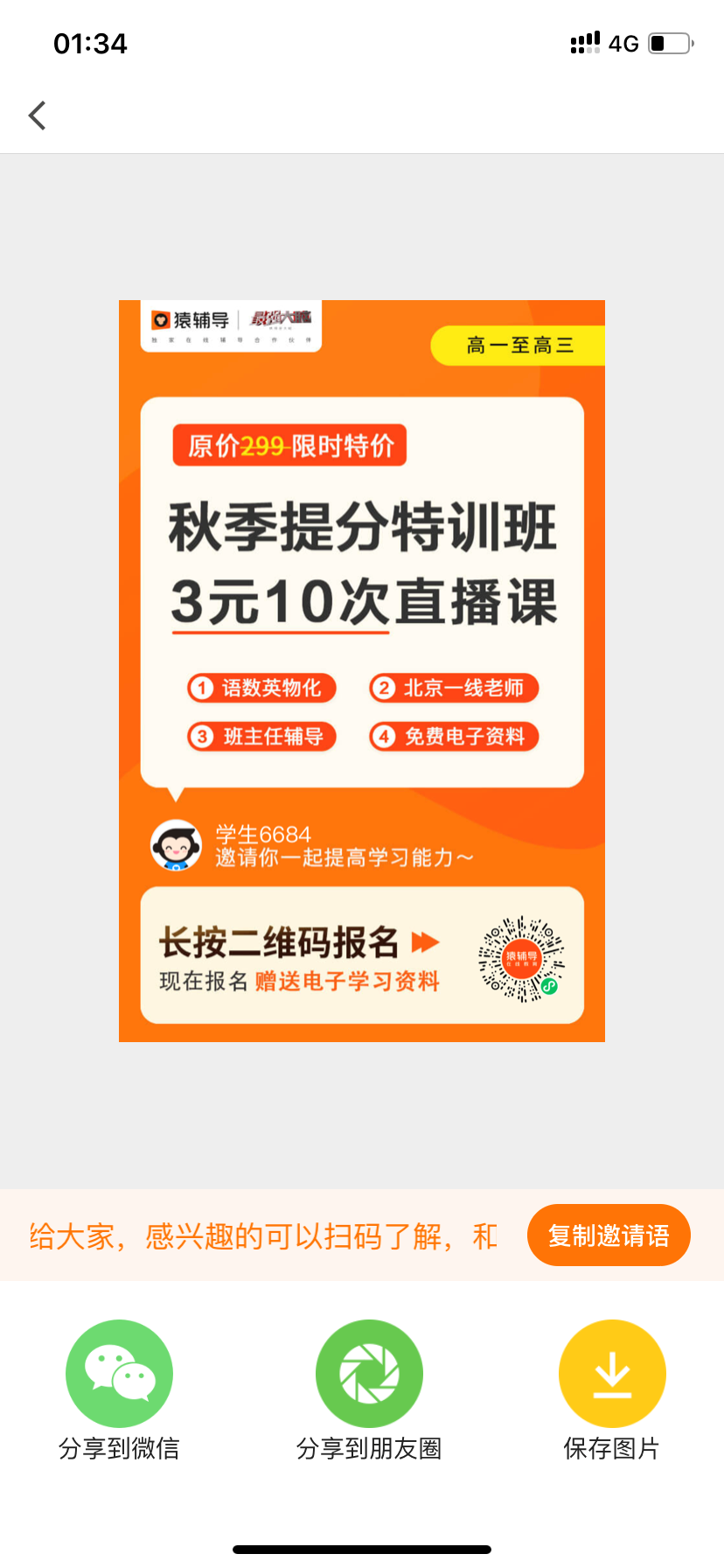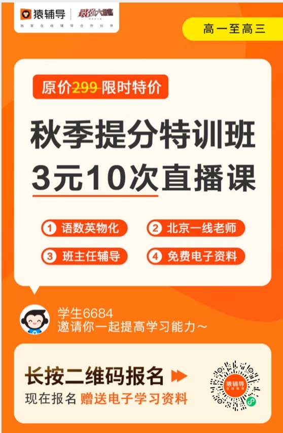 ”我已經(jīng)在猿輔導(dǎo)報(bào)名秋季提分特訓(xùn)班,3元10次課,涵蓋語(yǔ)數(shù)英物化五大學(xué)科,報(bào)名后還能找班主任老師領(lǐng)取多科電子教輔!推薦給大家,感興趣的可以?huà)叽a了解,和我一起進(jìn)步呀~“
