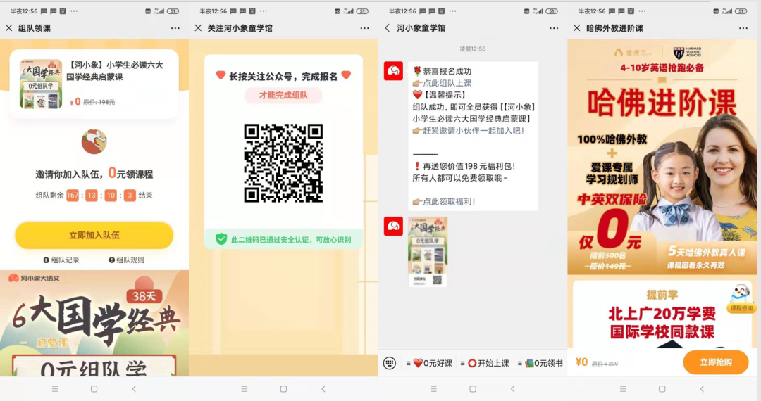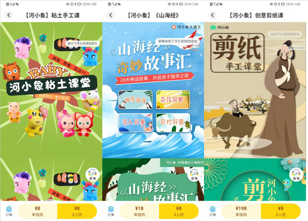 相比較一元學專區(qū),參團優(yōu)惠的頁面設(shè)置就顯得不專業(yè)。有拼團價格和單購價格一樣的低級失誤,也有差距不多,無法引導(dǎo)用戶立刻下單。雖然在右上角都通過跑馬燈顯示有家長參團,但是整體的吸引度不夠高,有很大的改動空間