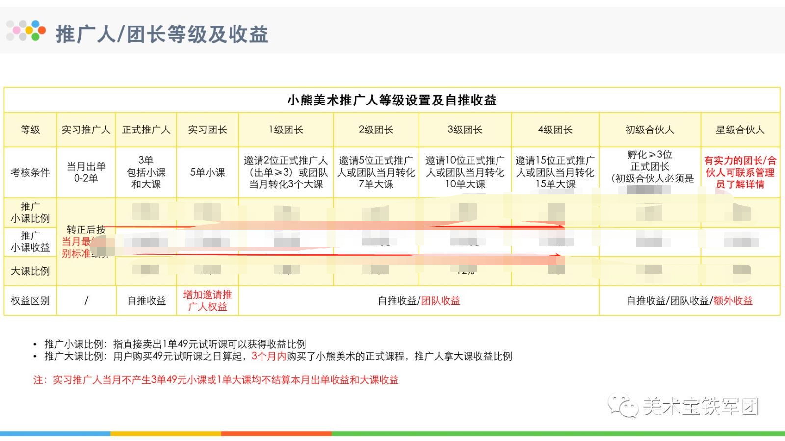 小熊美術(shù)傭金采用CPA+CPS的制度,體驗(yàn)課30%-40%的一級(jí)傭金比例和10%-15%,大課10%-12%的一級(jí)傭金比例和2.5%-5%的二級(jí)收益,并且星級(jí)合伙人享有10%的團(tuán)隊(duì)收益