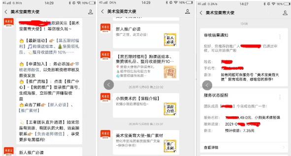 小熊對(duì)于推廣人實(shí)行審核制度,成為推廣人需要審核,審核成功后才能進(jìn)行推廣。并對(duì)推廣人進(jìn)行統(tǒng)一管理,一是通過(guò)公眾號(hào)和工作號(hào)進(jìn)行管理,另外就是通過(guò)社群進(jìn)行管理,有專屬的推廣人群。公眾號(hào)在用戶關(guān)注后會(huì)不斷彈出推廣人必讀、限時(shí)福利、課程介紹和推廣素材。用戶進(jìn)入社群后會(huì)進(jìn)行培訓(xùn)和限時(shí)的活動(dòng)來(lái)刺激分銷。