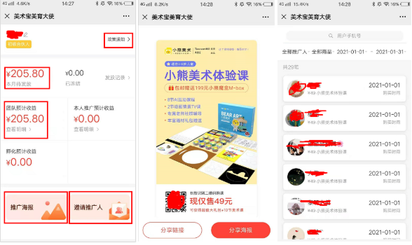 工欲善其事必先利其器,那就先拿分銷系統(tǒng)來(lái)說(shuō),小熊美術(shù)自建分銷系統(tǒng),畢竟有美術(shù)寶強(qiáng)大的技術(shù)團(tuán)隊(duì)做支撐。小熊美術(shù)的分銷系統(tǒng)是搭配專屬公眾號(hào)做的,可以實(shí)現(xiàn)成單的信息提醒和邀請(qǐng)信息的提醒。