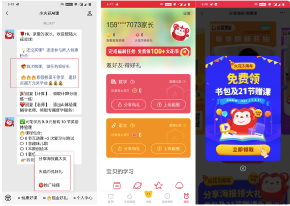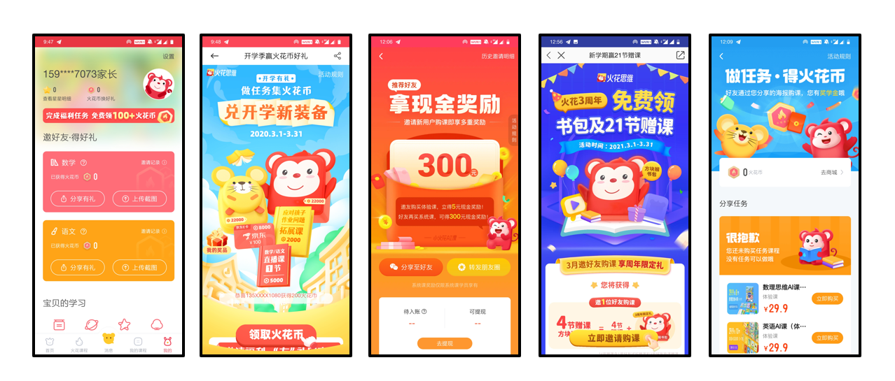 火花思維的轉(zhuǎn)介紹活動(dòng)非常多,常規(guī)的有每周任務(wù)——分享有禮,熱點(diǎn)營銷類的有“推薦好友賺學(xué)費(fèi)”、“集火花幣兌好禮”、“做任務(wù)集火花幣兌開學(xué)新裝備”、“三周年免費(fèi)領(lǐng)書包和贈課”等等。
