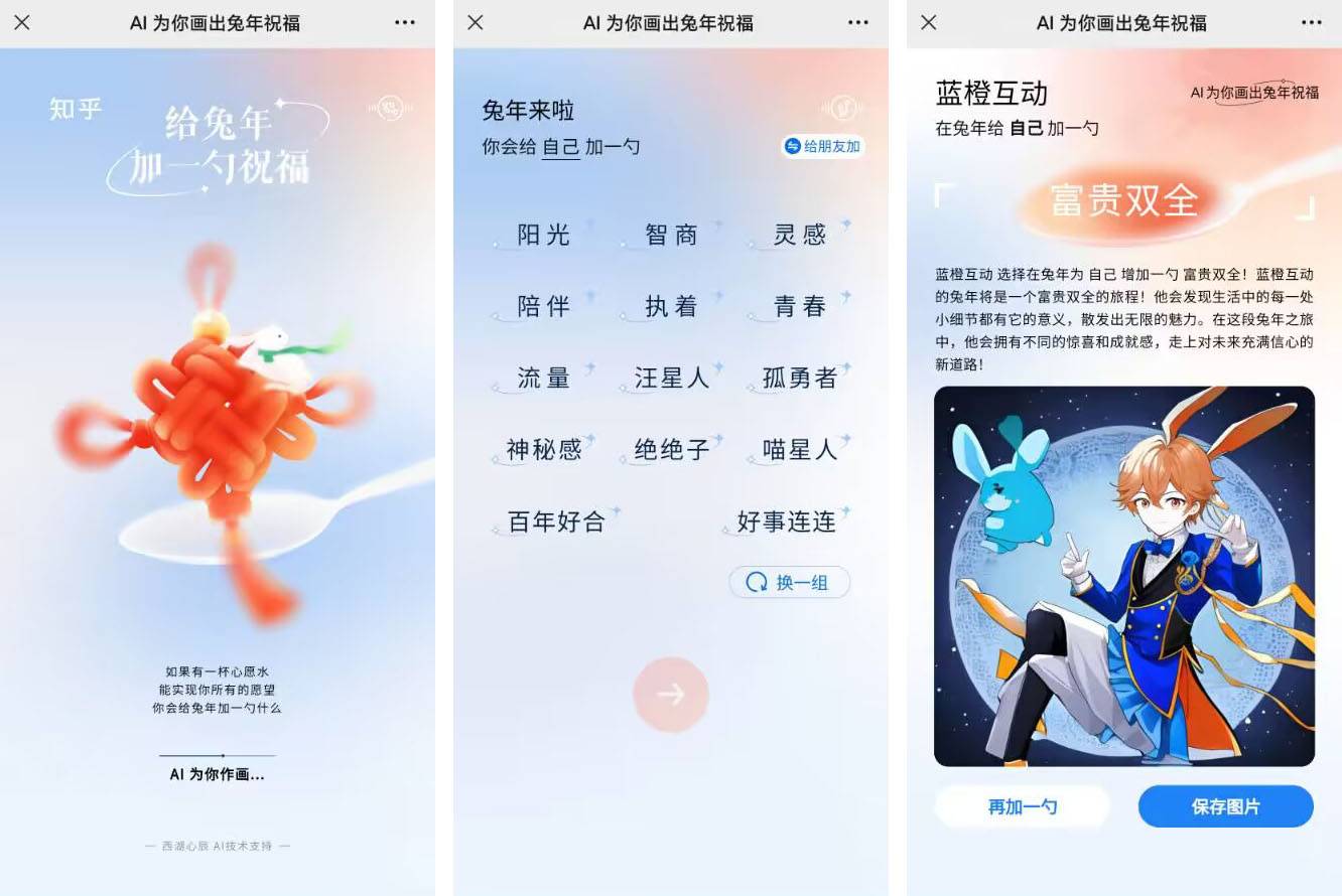 活動詳情:這是由知乎在2023年春節(jié)之際推出的AI作畫H5活動,以“AI為你畫出兔年祝福”為主題,通過讓用戶選擇關(guān)鍵詞,選擇送祝福的人,用AI生成一段兔年祝福話術(shù)和一幅卡通漫畫。依靠用戶分享實現(xiàn)節(jié)日期間的品牌裂變傳播。進入H5案例,加載頁拋出活動主題,如果有一杯心愿水,給兔年加一勺祝福,能實現(xiàn)你所有的愿望,你會給兔年加一勺什么?從給定的關(guān)鍵詞中選擇一個,如“健康”、“平安”、“中彩票”、“好睡眠”等等,用戶可自有切換挑選,然后點擊確定按鈕,輸入自己的昵稱,即可生成專屬AI繪畫。