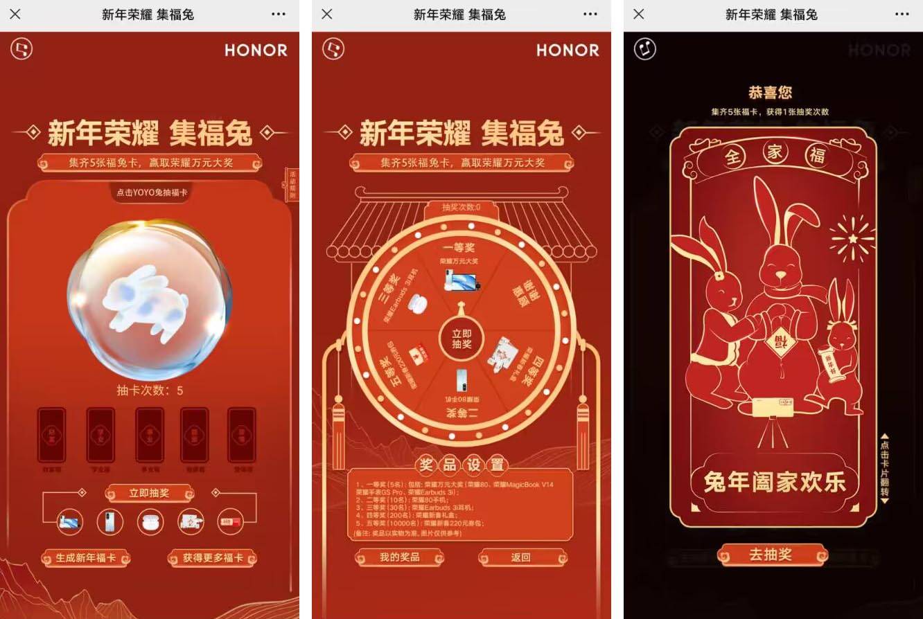 活動詳情:榮耀品牌在2023年春節(jié)之際推出的「新年榮耀 集福兔」創(chuàng)意H5作品。通過讓用戶集福兔,進行抽獎,過程中植入榮耀各種電子產(chǎn)品,形成有效曝光和品牌傳播。首次進入H5活動時,每位用戶默認有5次抽卡機會,點擊YOYO兔即可抽取福卡,每次抽獎都會獲得一張卡牌,正面是榮耀產(chǎn)品介紹,背面是一個福兔。用戶可在??ㄖ悬c擊“生成新年福卡”生成活動海報進行分享。抽卡機會使用完后可點擊“獲得更多???rdquo;進入每日任務(wù)獲取抽獎機會。集齊5個福兔可以進行一次大轉(zhuǎn)盤抽獎,獲得的獎品將在“我的獎品”列表里展現(xiàn)。