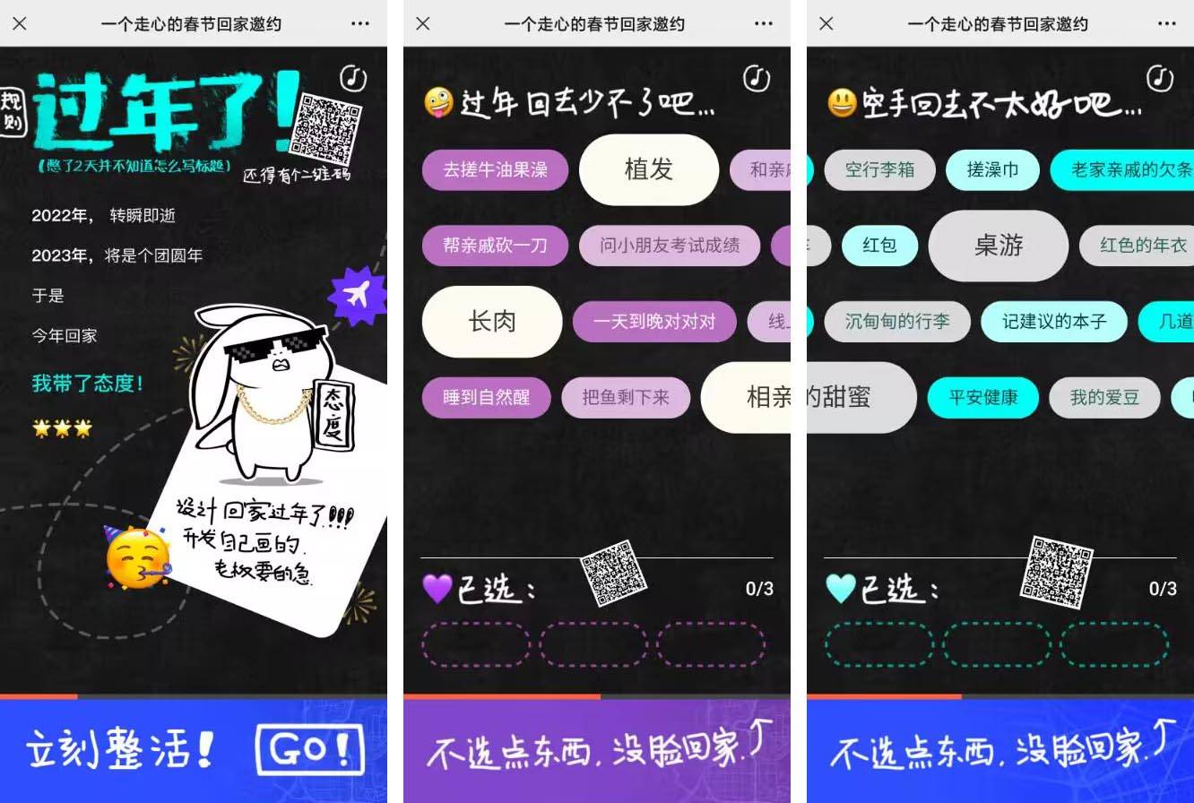 活動詳情:這是騰訊地圖在2023年春節(jié)之際推出的創(chuàng)意H5作品。以“一個走心的回家邀約”為主題,配合上搞笑的畫風(fēng),讓用戶參與互動,在過年回家之際進行裂變傳播,給品牌帶來更多的宣傳和曝光。進入H5案例,點擊立刻整活進入標簽選擇部分,分別有“空手回去不好,帶什么回家”、“過年回去少不了做什么”、“回家后想去哪里”三組標簽,一組標簽選擇完畢后可點擊切換到下一組。完成標簽選擇后將生成回家宣言海報,將用戶選擇標簽組合一段話,對春節(jié)回家的話題給出一個很好的解答維度。