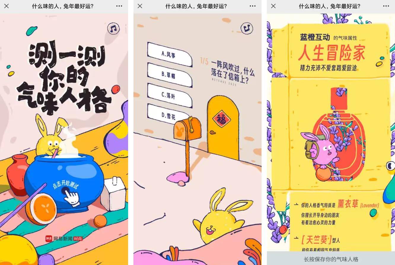 活動詳情:這是由網(wǎng)易時尚推出的春節(jié)H5活動,以“測一測你的氣味人格”為主題,融入原創(chuàng)兔年生肖主題形象,以氣味為抓手,圍繞“家”的意向場景,激發(fā)用戶的情緒共振。進入H5案例,首頁先引用跳躍的字體和跳動的小幅畫面向用戶解釋了“普魯斯特”效應(yīng),然后帶入主題邀請用戶進行測試。點擊開始后進入答題頁面,根據(jù)出現(xiàn)的問題選擇符合自己性格審美的答案即可,一共有六道問題,包括什么東西飄落到了信箱上,怎么安排自己的假期,漂亮的花花擺放在哪里,想要買什么顏色的沙發(fā),ta給你帶了什么禮物,選擇一個喜歡的花瓶樣式。完成答題后輸入用戶昵稱,生成測試結(jié)果海報,包括用戶的氣味屬性、人格特質(zhì)和氣味人格成分百分比。