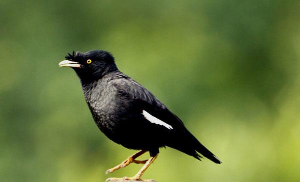 頭體長22-28cm,重78-150g,嘴峰1.6-2.6cm,翅1.1-1.5cm,尾0.6-0.9cm。外形大小和家八哥相似,通體黑色,前額有長而豎直的羽簇,有如冠狀,翅具白色翅斑,飛翔時尤為明顯。尾羽和尾下覆羽具白色端斑。嘴乳黃色,腳黃色。俗話說:人貴有志,鳥貴羽麗。羽毛是鳥的時裝和保護層,體壯的八哥必然是羽毛平整有紋,毛色黑亮并帶有金屬光澤。健康的八哥雙眼黑亮有神,身軀較大,站立姿態(tài)優(yōu)美,雙腳抓棲杠有力,食欲旺盛,喜歡鳴唱。