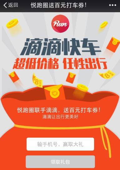 上面提到的滴滴打車,也聯(lián)合他們一起做了送百元話費的活動,輸入手機號就能獲得。這些活動門檻很低,只要多接觸,對于品牌曝光還是很有意義的。