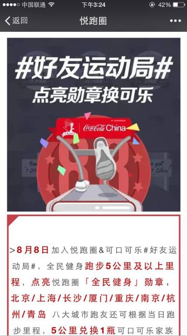 這次和可樂合作,我們做了這么件事,你只要用悅跑圈跑步里程,就能兌換可樂。當時花了不少精力來推動這個項目,也遇到了不少困難,尤其有個遺憾是最后只做了8個城市,后來我們復(fù)盤了整個活動,主要這次活動各個城市會要擺很多補給點,會和很多地方扯上關(guān)系,加上時間有限。