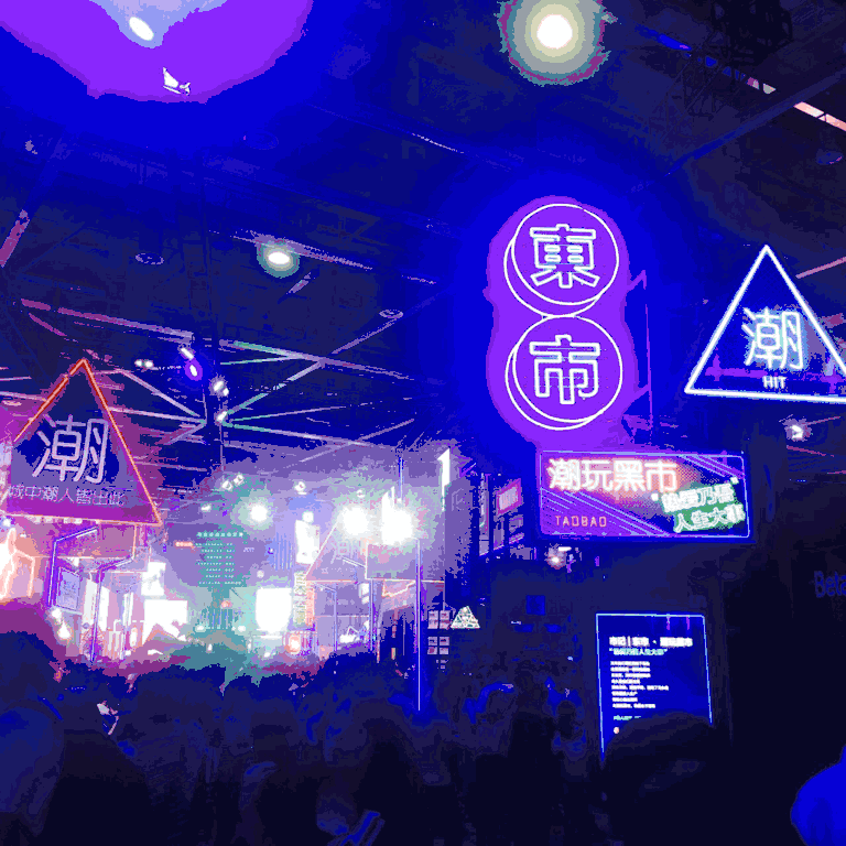 今年的活動(dòng)代理商仍然是HOFO公司。造物節(jié)整個(gè)策劃過(guò)程歷時(shí)100多天,HOFO先為每家快閃店確定核心主題,在此基礎(chǔ)上再開(kāi)展視覺(jué)創(chuàng)作及互動(dòng)體驗(yàn)策劃。而為了突出江湖街市的氛圍營(yíng)造,HOFO把現(xiàn)場(chǎng)設(shè)計(jì)的重心擺在了街景上。例如主推潮流的「 東市 」街景,正是他從《攻殼特工隊(duì)》中霓虹夜景和未來(lái)元素中尋找的靈感。而主題為幸福街區(qū)的西市,這是從宮崎駿的作品中找到色彩搭配思路。