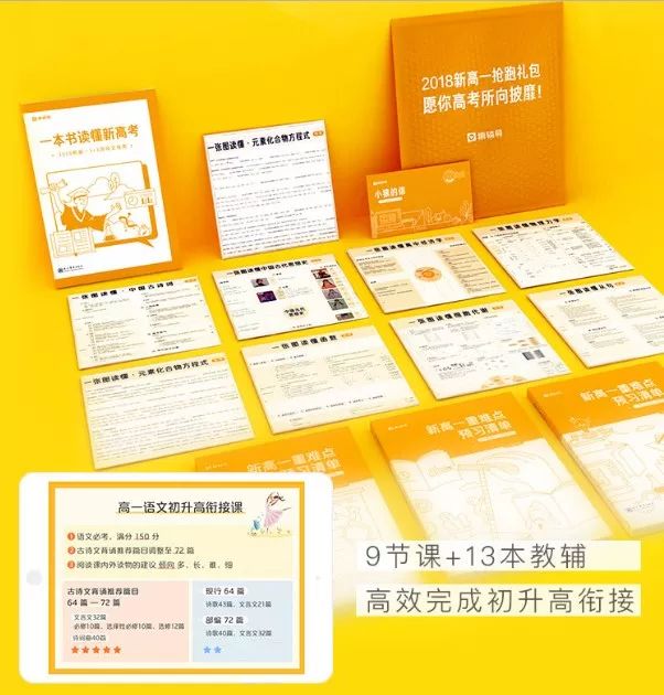 9節(jié)直播課+13本教輔,幫助新高一和新高三學(xué)生在暑假快人一等,彎道超車。13本教輔,包括3本重難點(diǎn)預(yù)習(xí)清單+9張針對(duì)每科的知識(shí)圖譜+1本讀懂新高考,不僅設(shè)計(jì)精美,教輔內(nèi)容全擊中學(xué)生用戶的痛點(diǎn),還1元包郵,省去了用戶的決策時(shí)間,下意識(shí)就是買買買!