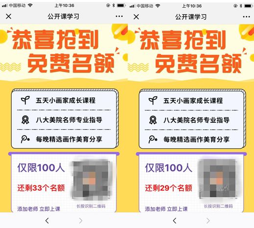 所以,K12的家長拼團(tuán)課才是我們的首選戰(zhàn)場(chǎng)。拼團(tuán)課建議以講座形式進(jìn)行,主題內(nèi)容圍繞親子話題和學(xué)科規(guī)劃,每周可以換著主題發(fā)布拼團(tuán)活動(dòng),讓用戶養(yǎng)成聽課習(xí)慣。在拼團(tuán)頁面,實(shí)時(shí)顯示剩余名額,和下期開課時(shí)間,促進(jìn)家長快速下單。