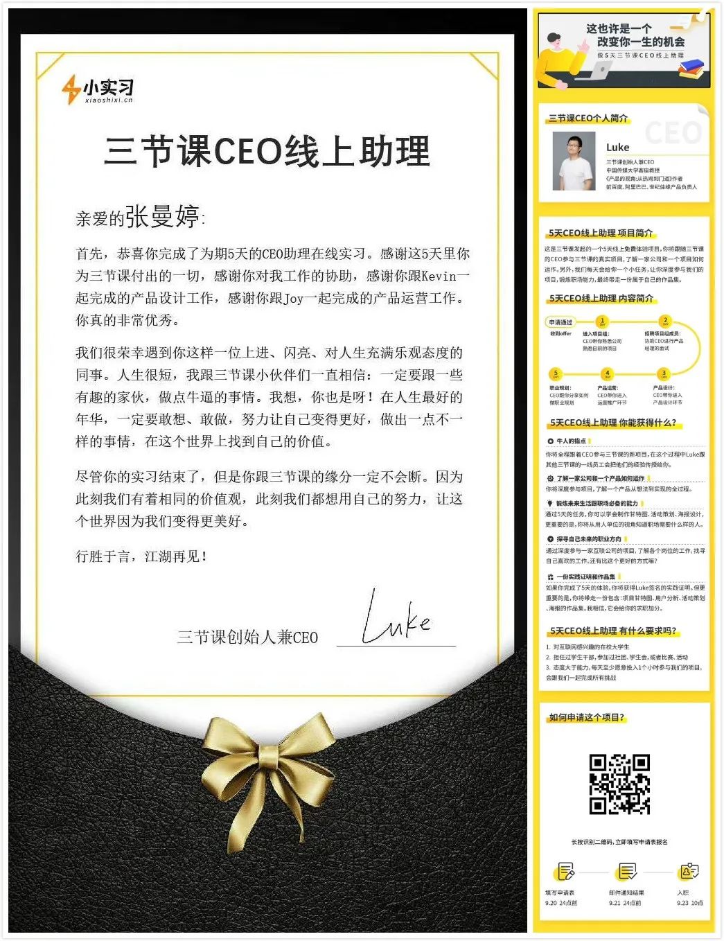 第一次聽說個(gè)項(xiàng)目是在朋友圈,看到一位十分優(yōu)秀的學(xué)姐發(fā)了一個(gè)圖片,上面寫有三節(jié)課小實(shí)習(xí)項(xiàng)目的招募要求和篩選條件,并配文字說道“很榮幸參加了三節(jié)課小實(shí)習(xí)項(xiàng)目,大家都很優(yōu)秀,導(dǎo)師對我?guī)椭艽蟆?,一張三?jié)課CEOLuke簽發(fā)的證書放在了動(dòng)態(tài)內(nèi)。