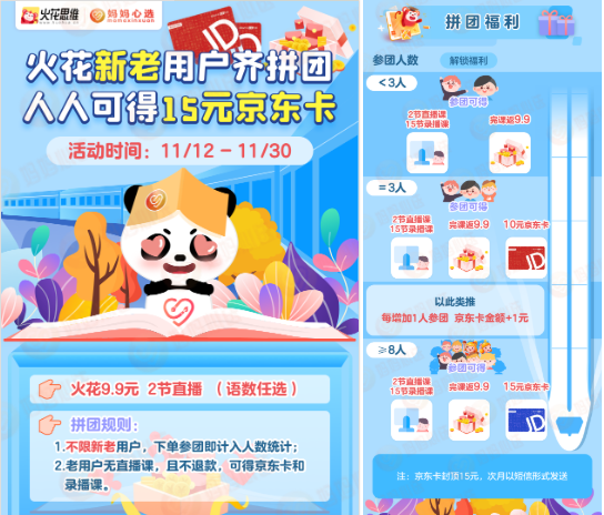 火花思維聯(lián)合合作渠道媽媽心選通過(guò)拼團(tuán)享優(yōu)惠的方式來(lái)短時(shí)間提升從渠道的獲客量。本次活動(dòng)是這樣的,在媽媽心選參團(tuán)購(gòu)買火花思維的體驗(yàn)課(?2節(jié)火花思維直播課語(yǔ)數(shù)任選+15節(jié)思維訓(xùn)練錄播課+完課返9.9元),參團(tuán)鏈接內(nèi)團(tuán)員≥3人,人人可得10元京東卡;團(tuán)員=4人,人人可得11元京東卡;依此類推,每增加1名團(tuán)員,京東卡每人加1元,上限15元京東卡;團(tuán)員≥8人,參團(tuán)即得15元京東卡。并且不限新老用戶,新用戶得全部,老用戶無(wú)直播課!
