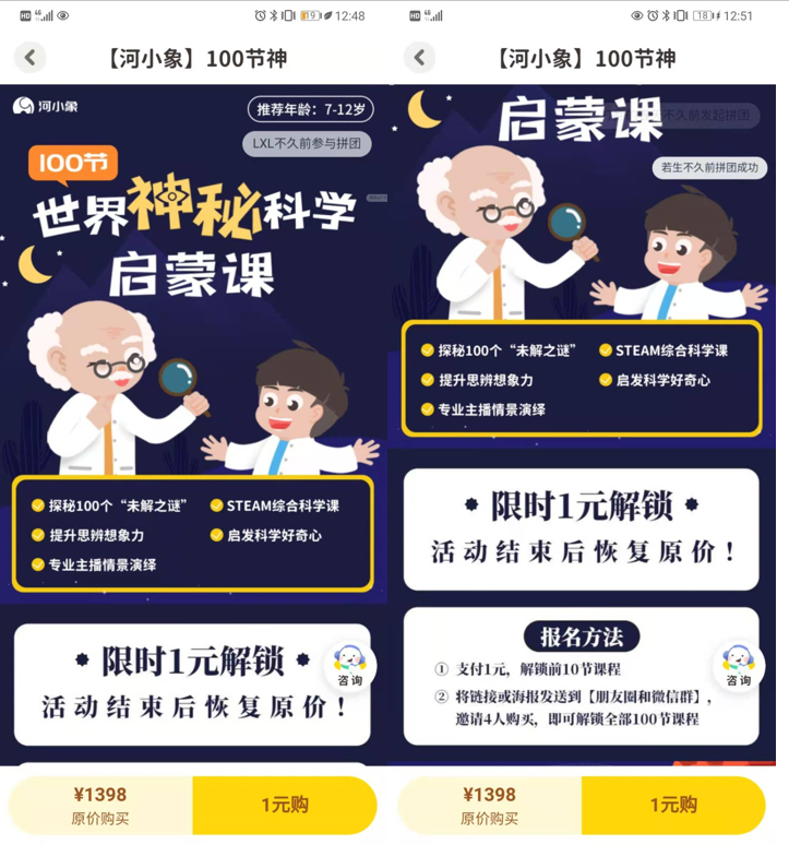 河小象在1元購的拼課環(huán)節(jié)巧妙設(shè)置,在詳情頁的首頁(也就是一整個手機屏幕),強調(diào)【限時1元解鎖,活動結(jié)束后恢復(fù)原價】,同時在尾部設(shè)置價格錨點【原價1398元】刺激用戶立刻下單。但是往下拉一段發(fā)現(xiàn),支付的1元只能解鎖前10節(jié)課程,后面的課程需要邀請新用戶購買才可以全部解鎖。不少用戶會在第一個頁面直接購買,購買后才發(fā)現(xiàn)需要邀請新用戶。這里影響了用戶體驗,但是也抓住了用戶逐利心理,既然已經(jīng)支付1元,那么再去邀請新用戶也無妨。