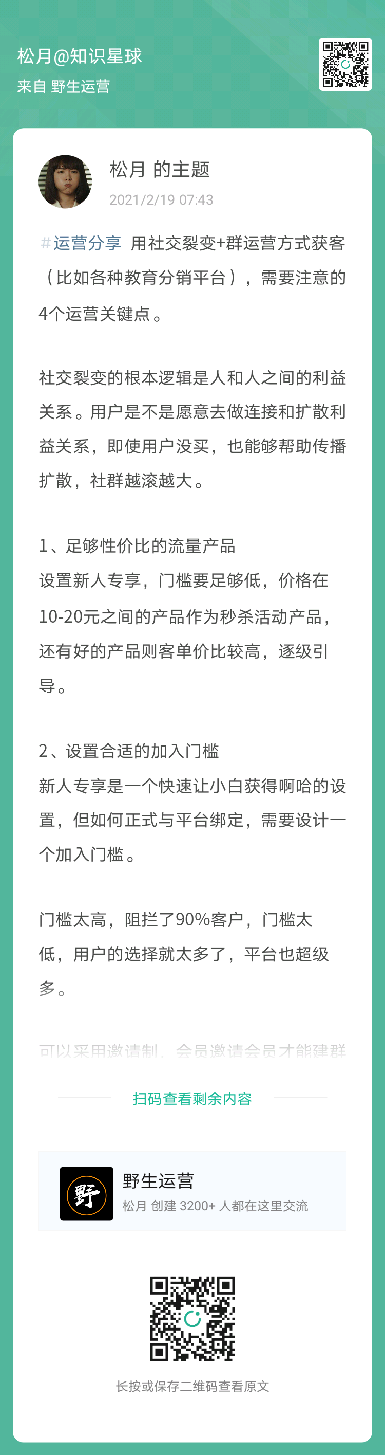 11、松月:用社交裂變+群運(yùn)營方式獲客(比如各種教育分銷平臺(tái)),需注意的4個(gè)運(yùn)營關(guān)鍵點(diǎn)(掃碼看全文)