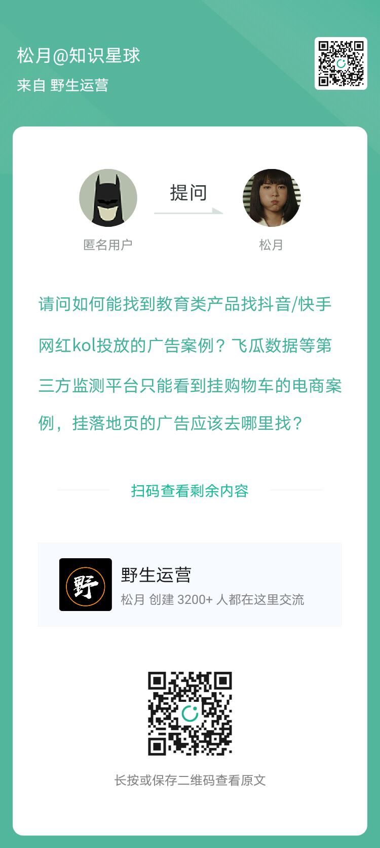 1、提問:如何能找到教育類產(chǎn)品找抖音/快手網(wǎng)紅kol投放的廣告案例?(掃碼看全文)
