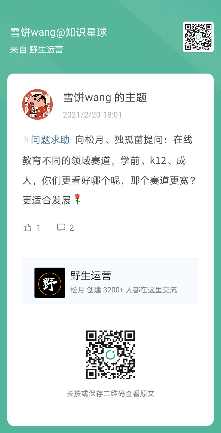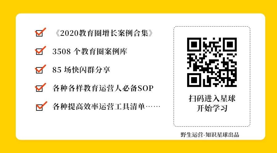 歡迎加入野生運(yùn)營星球,每周一次快閃分享、教育圈一手資料、1V1答疑……等硬核干貨,而且還能一次入手包括 《2020年教育圈增長案例合集》、3508 個(gè)在線教育圈案例合集全庫、70 頁下沉市場觀察合集、85 場群分享的音頻+逐字稿、N多運(yùn)營工具包和資料,就問你一句,值不值?
