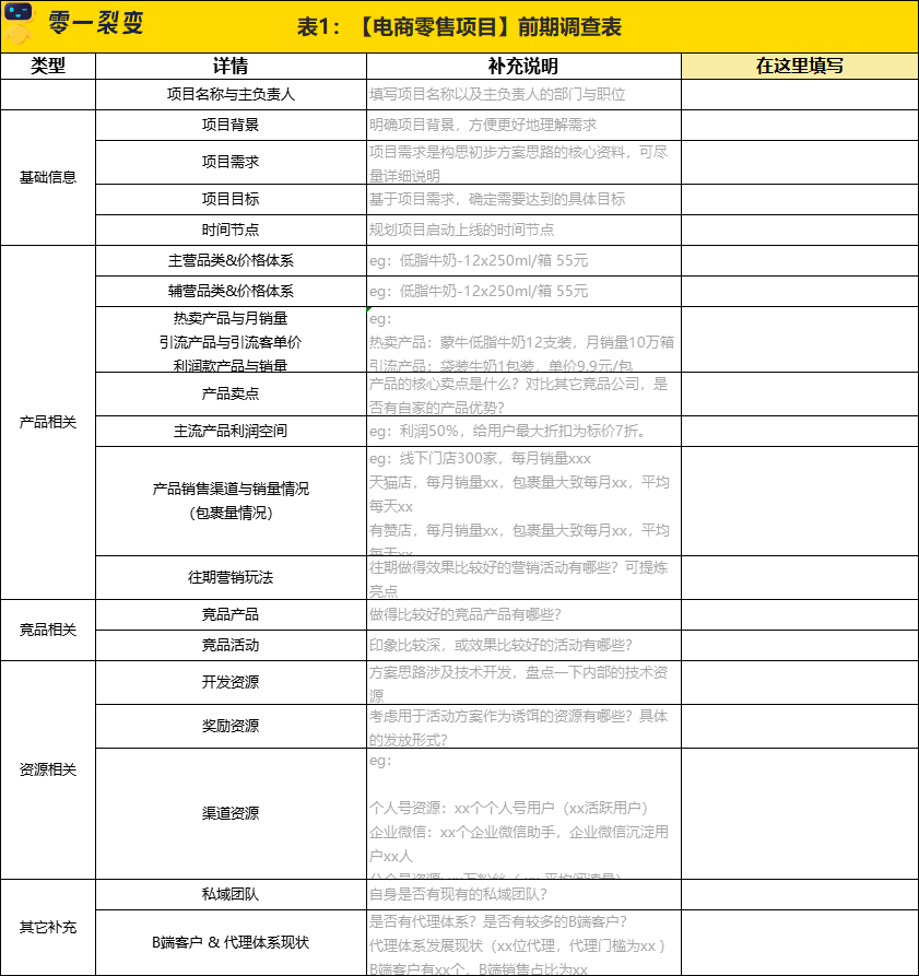 先填寫項(xiàng)目前期調(diào)查表,了解和挖掘項(xiàng)目的背景、需求、預(yù)期效果、渠道情況、產(chǎn)品情況等等,為項(xiàng)目籌備做好第1步準(zhǔn)備工作。