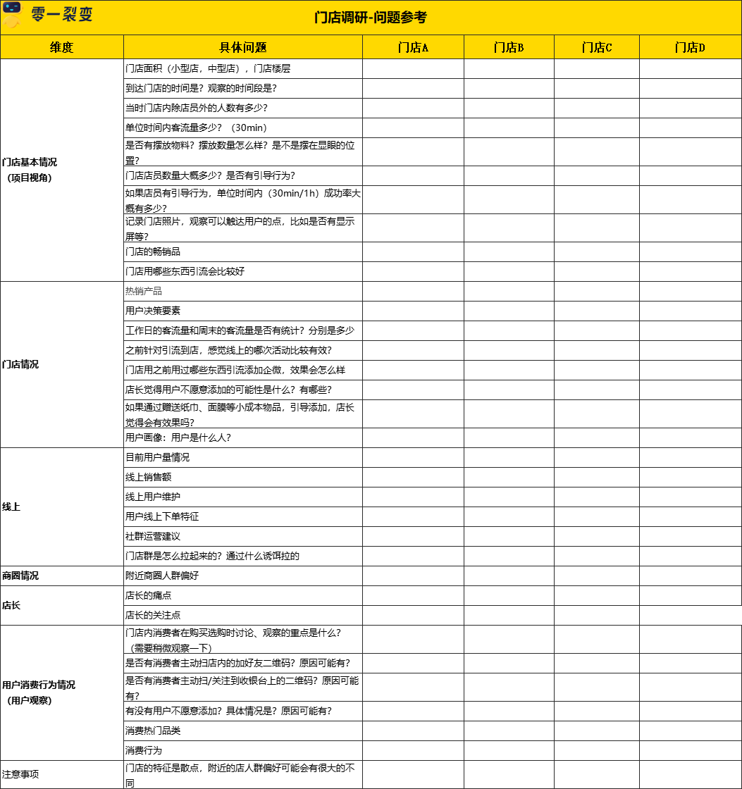 對門店進(jìn)行調(diào)研,可以從項(xiàng)目視角出發(fā),了解門店的基本情況,員工情況,用戶消費(fèi)情況等。