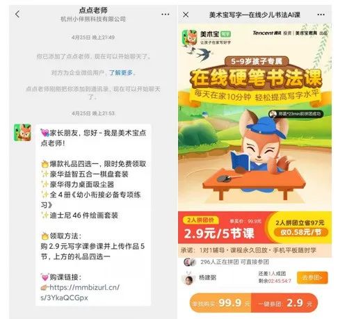 用戶(hù)加上美術(shù)寶企業(yè)微信的第一時(shí)間,就會(huì)收到活動(dòng)話(huà)術(shù)和低價(jià)課拼團(tuán)鏈接,課程價(jià)格不貴,但用戶(hù)需要購(gòu)課并上傳作品之后,才能領(lǐng)取禮品。
