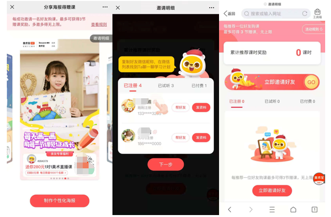 另外一種增長(zhǎng)方式,就是上面提到的「邀請(qǐng)有禮」活動(dòng),當(dāng)用戶(hù)把自己的專(zhuān)屬海報(bào)分享出去之后,可以「邀請(qǐng)明細(xì)」鏈接查看自己分享的實(shí)時(shí)情況,包括「已注冊(cè)」多少,「已試聽(tīng)」多少,以及「已付費(fèi)」多少,一目了然。
