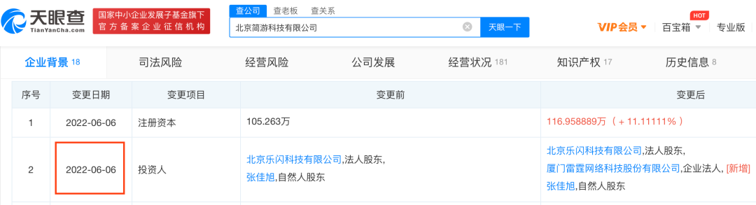 天眼查顯示,該公司股東信息中,由張佳旭、廈門雷霆網(wǎng)絡(luò)科技股份有限公司、北京樂閃科技有限公司共同持股。其中廈門雷霆網(wǎng)絡(luò)于今年6月入股,持有簡(jiǎn)游科技10%的股份,為第二大股東。