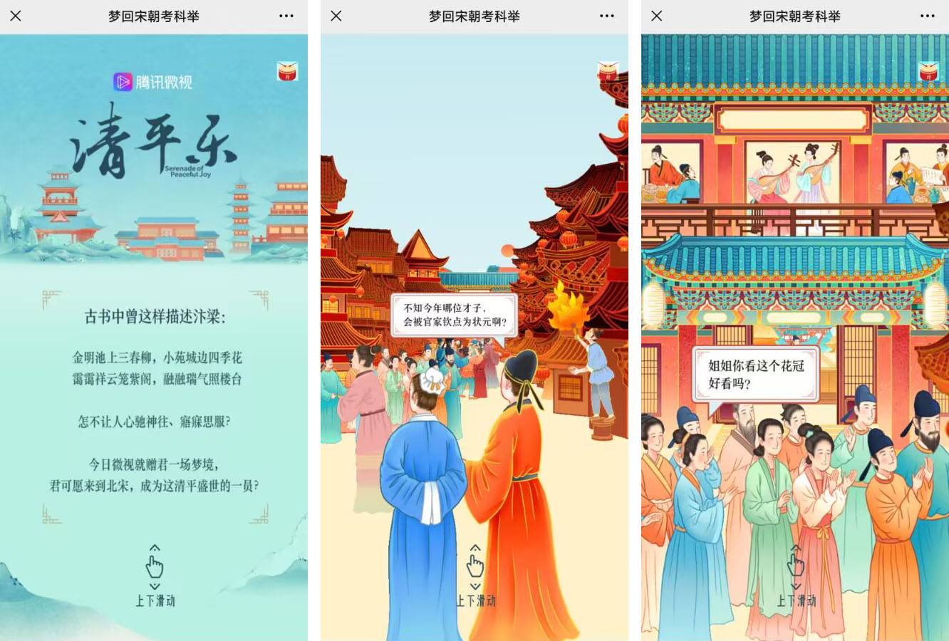 項(xiàng)目亮點(diǎn):首頁(yè)以古建筑為背景,通過一段文案邀請(qǐng)用戶來(lái)到北宋,成為這清平盛世的一員。進(jìn)入一鏡到底展示頁(yè)面,上下滑動(dòng)屏幕,畫面縱向深入,汴梁城的城門映入眼簾,入城內(nèi)是城市街道的繁華,兩邊建筑物,中間是宋朝的人,穿越的過程中不斷聽到街道人物的對(duì)話,主要是討論科舉,還有蜜餞果子鋪(看過《清平樂》的用戶應(yīng)該知道這個(gè)地方);穿過街道,是江湖,山河,配合古琴的彈奏,一句句詩(shī)詞拂面而來(lái)。最后來(lái)到一群很高的殿堂,官家正坐其中,官家說(shuō)科舉在即,號(hào)召大家一起回答問題,贏取現(xiàn)金紅包。