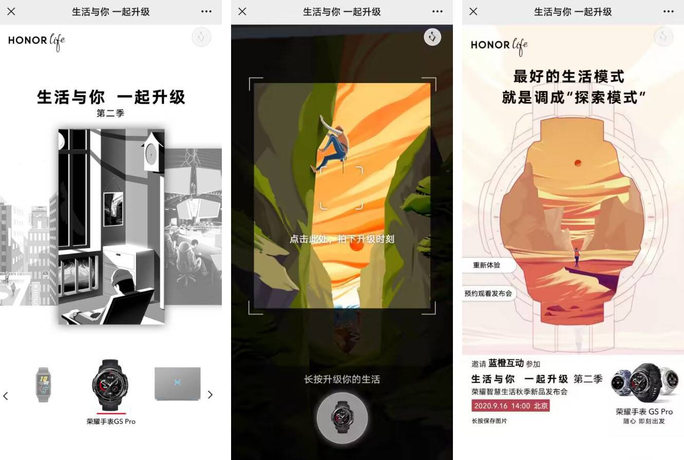 項(xiàng)目亮點(diǎn):滑動(dòng)屏幕從3款新產(chǎn)品中選擇一款裝備為生活升級(jí),并長(zhǎng)按開啟一鏡到底H5頁(yè)面,畫面由黑白進(jìn)入彩色,代表開啟新的生活方式/狀態(tài);長(zhǎng)按的過程中,松手即可定格畫面,定格后點(diǎn)擊,點(diǎn)擊此處拍下升級(jí)時(shí)刻,也可以一直長(zhǎng)按直到最后自動(dòng)定格。點(diǎn)擊確定升級(jí)后進(jìn)入海報(bào)生成頁(yè)面,包括用戶的定格圖、所需產(chǎn)品以及新品發(fā)布會(huì)預(yù)告,用戶可以長(zhǎng)按保存,或者預(yù)約觀看發(fā)布會(huì)。本次H5中收錄了榮耀手表GS Pro、榮耀手表ES、榮耀獵人游戲本三個(gè)產(chǎn)品,都有不同的一鏡到底展示頁(yè)面。