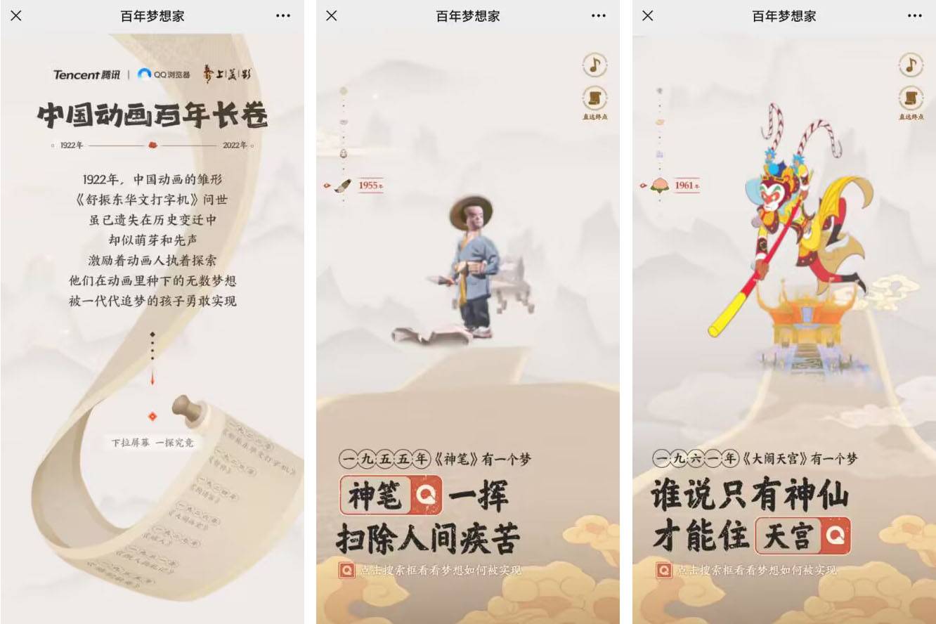 項(xiàng)目亮點(diǎn):H5分為兩個(gè)部分,第一分部是一個(gè)引導(dǎo)視頻,用中國(guó)百年動(dòng)畫片里的美猴王、葫蘆娃、黑貓警長(zhǎng)等動(dòng)畫片情節(jié)來(lái)映射現(xiàn)實(shí)中航天、入海、開山、零售、糧食、自然生態(tài)等發(fā)展成就。第二部分以一鏡到底的形式展示中國(guó)動(dòng)畫100年優(yōu)秀的動(dòng)畫人物,用戶通過上劃屏幕,可以按年限瀏覽對(duì)應(yīng)年份的IP人物形象。如《鐵扇公主》、《馬良》、《大鬧天宮》等等著名動(dòng)畫,最后生成中國(guó)動(dòng)畫百年長(zhǎng)卷海報(bào),用長(zhǎng)圖形式把中國(guó)動(dòng)畫100年關(guān)鍵IP形象按年份逐一畫出,用戶可長(zhǎng)按圖片保存或分享。