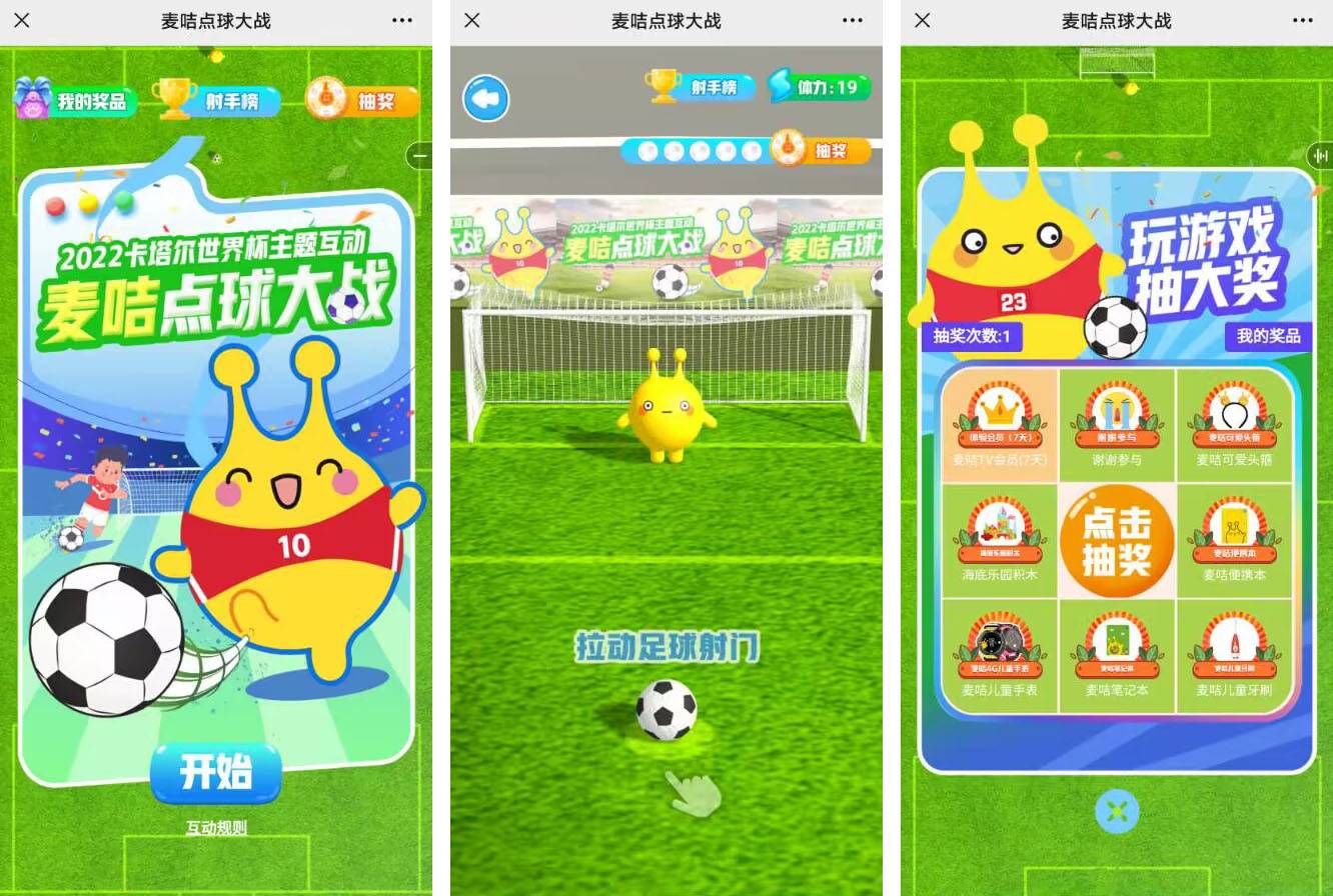 項目背景:世界杯正在如火如荼的進行中,你是不是也想來兩球過過癮?麥咭公仔當守門員,用戶踢球,感受進球的快樂,每滿五個進球即可獲得一次抽獎機會。