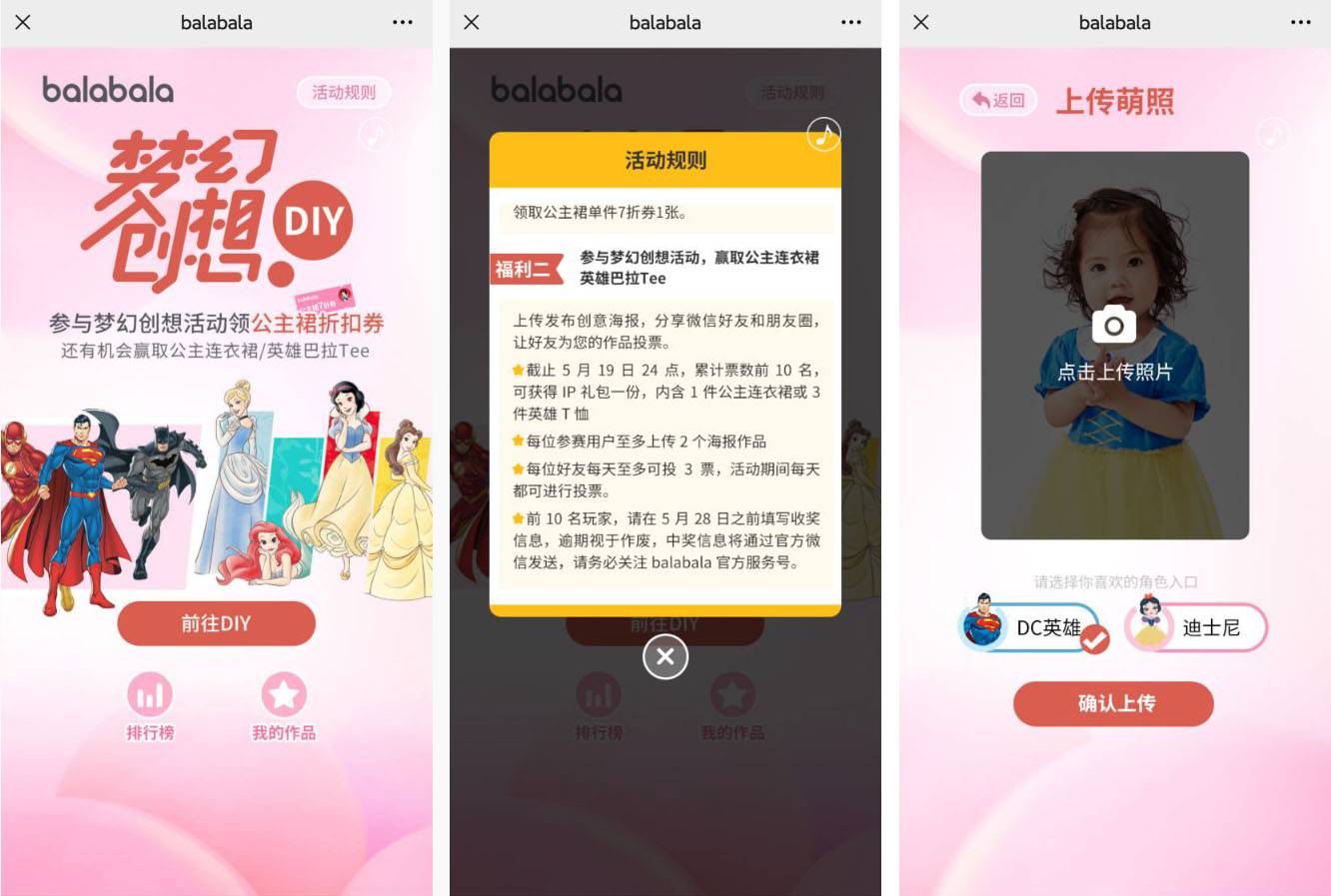案例參考:這是由balabala出品的海報(bào)投票H5案例,用戶(hù)需要上傳圖片,并從DC英雄或迪士尼中選擇裝飾風(fēng)格,并通過(guò)背景、角色、裝飾、巴拉元素和文字裝飾等元素選擇DIY一張海報(bào)進(jìn)行參賽,然后分享給好友進(jìn)行投票,每位好友每天至多可投3票。