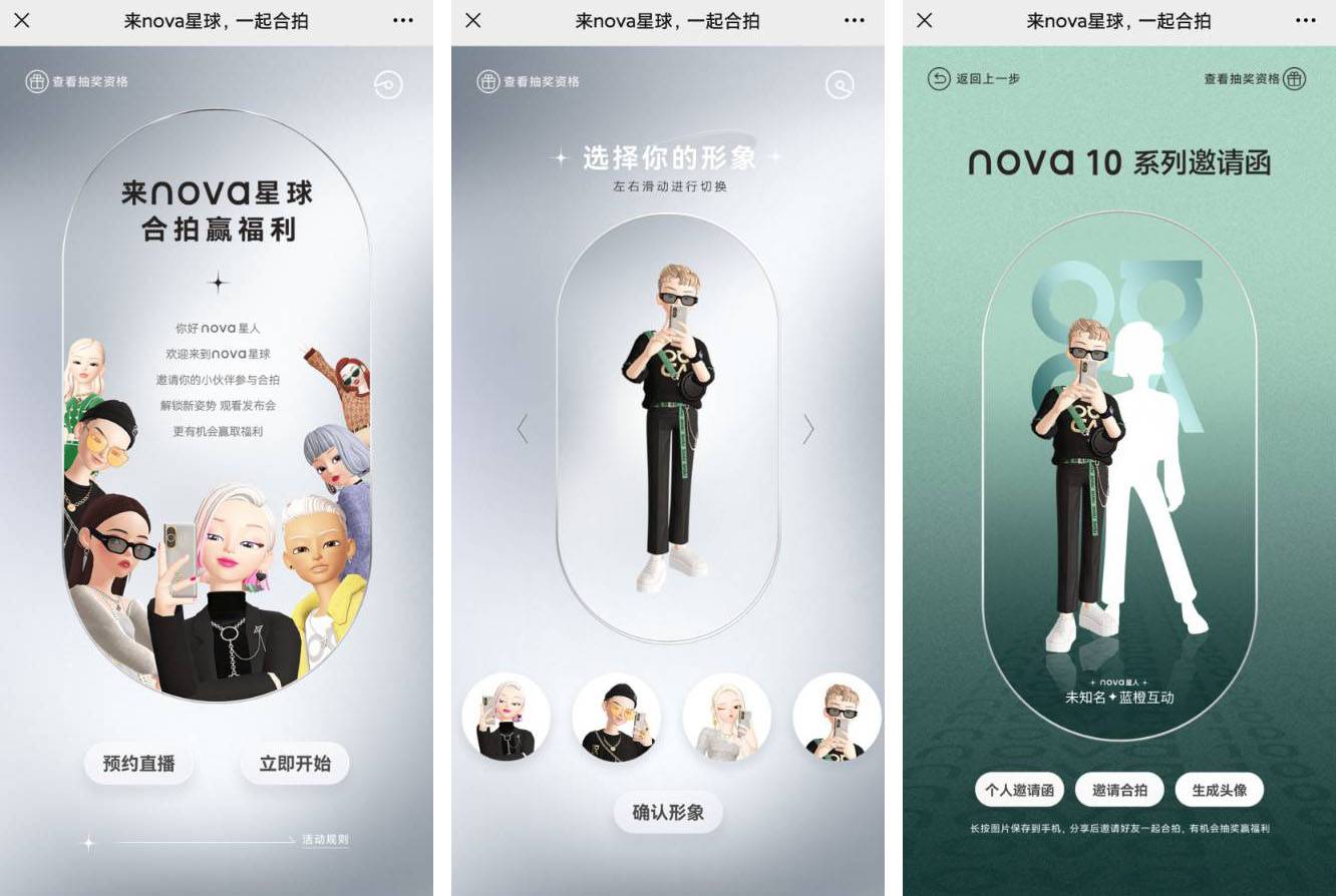 案例參考:華為NOVA10新機(jī)發(fā)布預(yù)告活動(dòng)就是采用的這種助力H5形式,用戶(hù)進(jìn)入個(gè)人形象定制頁(yè)面,在頁(yè)面中左右滑動(dòng)進(jìn)行切換,確定個(gè)人心儀的形象以及背景板,并輸入自己的昵稱(chēng),生成另一個(gè)人是空白的雙人海報(bào)。再將H5發(fā)給好友邀請(qǐng)合拍,好友接受邀請(qǐng)后打造自己的形象,生成完整的雙人海報(bào)。