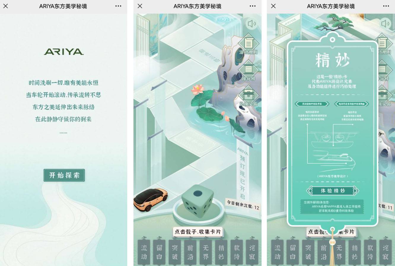 案例參考:這是由東風(fēng)日產(chǎn)ARIYA款汽車(chē)宣傳作品,在東方意境的行云流水中收獲卡片,兌換獎(jiǎng)品和沖擊排行榜,每一張卡片都有著詩(shī)詞畫(huà)意的名字,同時(shí)代表一項(xiàng)ARIYA設(shè)計(jì)優(yōu)勢(shì),一邊了解汽車(chē),一邊感受素雅的意境美帶來(lái)的平靜心緒。用戶(hù)可以用自己的卡片兌換獎(jiǎng)品,或與好友交換,互通有無(wú),達(dá)到獎(jiǎng)品兌換要求。
