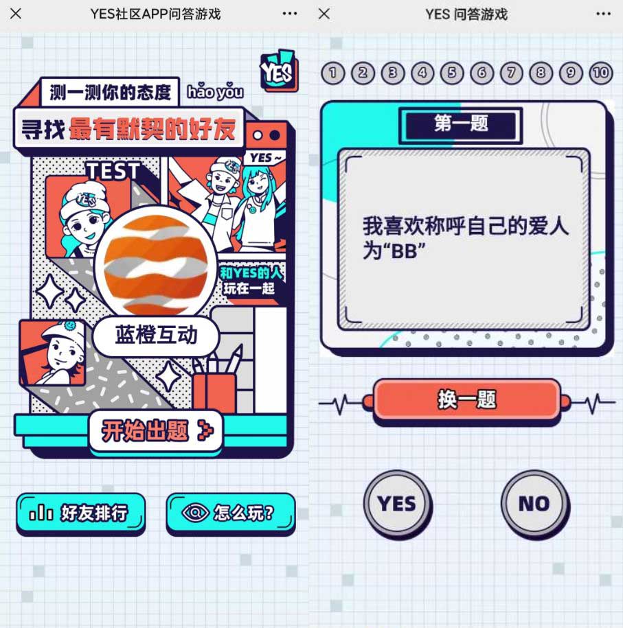 案例參考:這是由YES社區(qū)推出的好友助力答題H5游戲,H5分為兩個(gè)部分進(jìn)行,第一部分是用戶(hù)自己在H5中設(shè)置問(wèn)題,讓后分享給好友;第二部分則是好友受到邀請(qǐng)后參與答題,然后測(cè)試出用戶(hù)與其好友的默契程度。用戶(hù)可分享給多名好友,并生成默契度排行榜,從而促進(jìn)用戶(hù)分享邀請(qǐng)更多好友參與活動(dòng)。