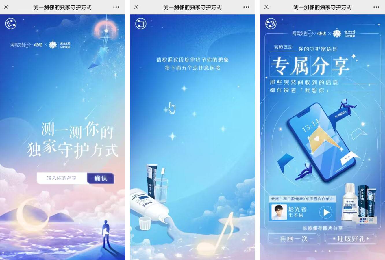 案例參考:這是由云南白藥與網(wǎng)易新聞聯(lián)合推出的畫圖測試H5,用戶可以聆聽音樂,根據(jù)內(nèi)心的感覺把給出的五顆星星按任意順序連接起來,H5將進行解析,將連接出的圖案會逐漸演化成一幅畫作,測試出用戶的獨家守護方式,借此突出云南白藥在口腔方面的“守護”主旨。