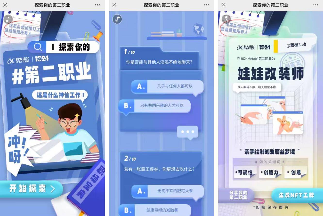 案例參考:這是科大訊飛為2022年全球 1024 開發(fā)者節(jié)宣傳推出的測試類H5活動案例,邀請大家參與答題測試,完成答題后根據(jù)用戶選項生成屬于用戶的第二職業(yè)海報,還可上傳一張正面照片,生成專屬的職業(yè)虛擬人工牌,獲取“探索你的第二職業(yè)”紀念版數(shù)字藏品。