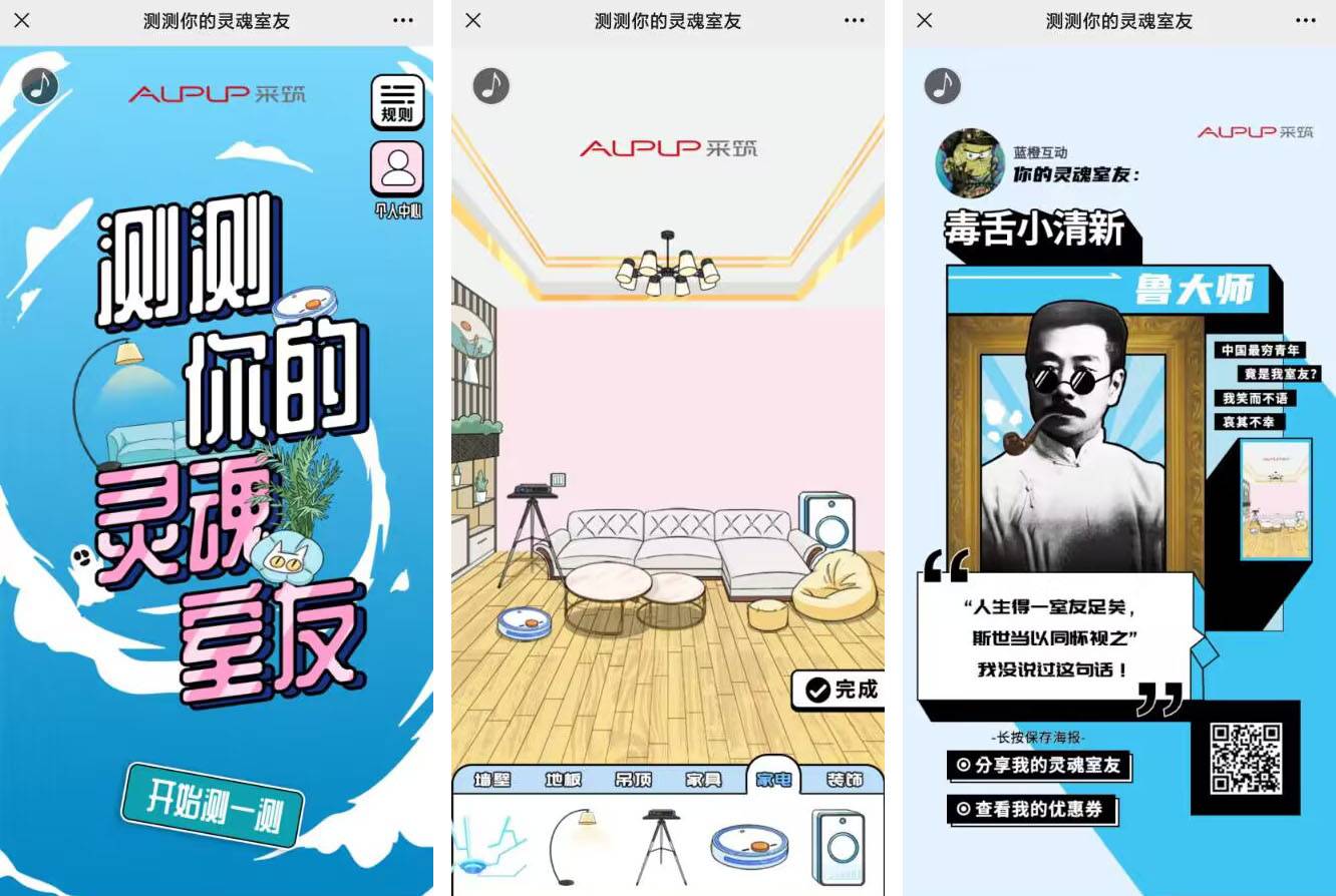 案例參考:這是由采筑電商平臺推出的DIY海報測試H5,可進入“毛坯”客廳開始裝修,通過選擇壁紙、地板、家具、家電、裝飾等大類下面的不同選項,定制化搭配出屬于自己的理想客廳,再根據(jù)客廳的裝修品味測試出與用戶匹配的“靈魂室友”,并且生成詼諧幽默的海報。