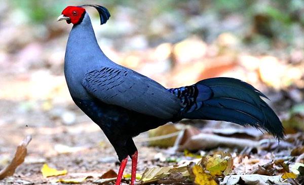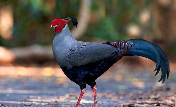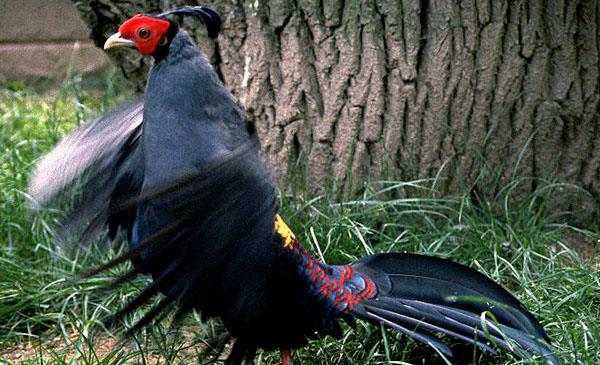 泰國國鳥,雄雞面部裸露鮮紅明艷,體色不如環(huán)頸雉靚麗,但羽冠非常有特點,黑色羽冠一簇一簇似孔雀翎,前段細小,末端則變大,但如絲線般柔軟,與其他雉雞羽冠大不相同。